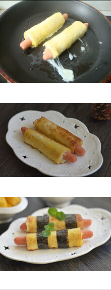 吐司熱狗的材料:吐司2片,雞蛋1個(gè),海苔適量,火腿腸2個(gè),鹽 美食網(wǎng)