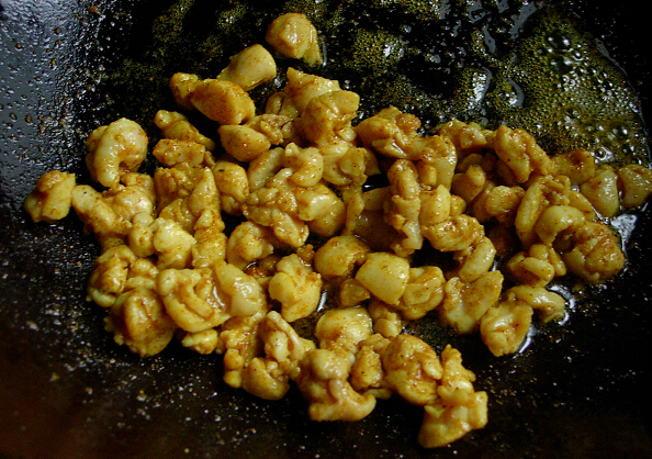 2、做鍋倒油,油燒至六七成熱時放入咖喱粉略炒(注意:為防止枯焦,火關小或者離火炒)后放雞丁,然后放玉米粒、豌豆粒、米飯(最好是冷藏過的隔夜的米飯,大火顛炒,略調(diào)鹽即可。