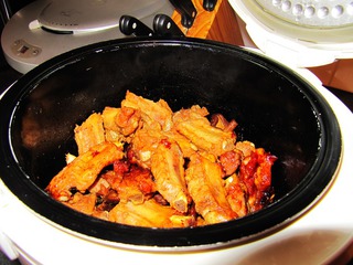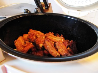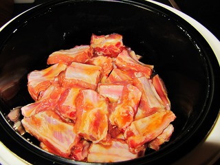 5、取出腌制過(guò)的排骨,然后整齊碼入電飯鍋內(nèi)。