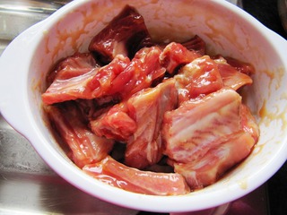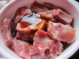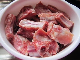 1、新鮮排骨,斬成中等大小塊狀,用清水反復(fù)泡洗干凈;并濾干水分,裝入碗里。