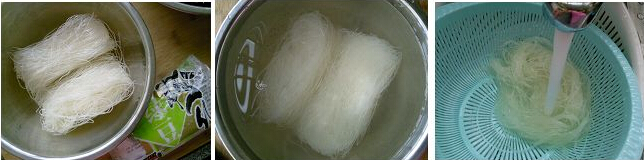 2、粉絲用40度左右的溫水浸泡10分鐘,用自來水沖涼降溫,剪成約15厘米長的段,放通風(fēng)處晾干半小時。充分晾干后的粉絲感覺軟而不爛。