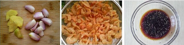 3、準(zhǔn)備好姜片和紅蔥頭,海米泡軟后洗干凈晾干,小碗中調(diào)入生抽、老抽、黃酒和胡椒粉,混合均勻備用。