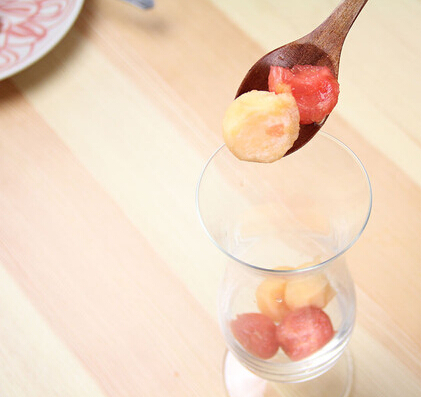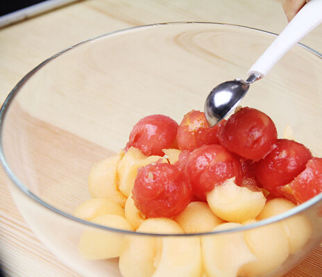 1、挖水果球:哈密瓜切半,去掉中間的籽,用挖冰淇淋的半圓勺子做出一個(gè)個(gè)的小球。西瓜切半,也用冰淇淋勺挖出小球。