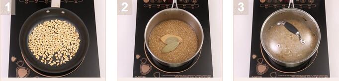 1.松子仁用中火不加油炒香,約3-4分鐘;