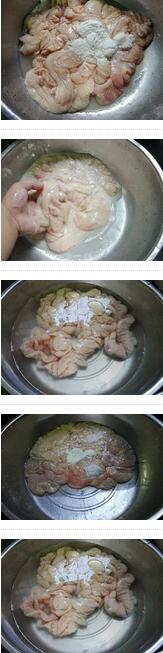 2.大腸再次加入2勺淀粉,2勺鹽再次搓到那些臟多東西掉為止,再次過清水,多洗幾次,洗到直到水清