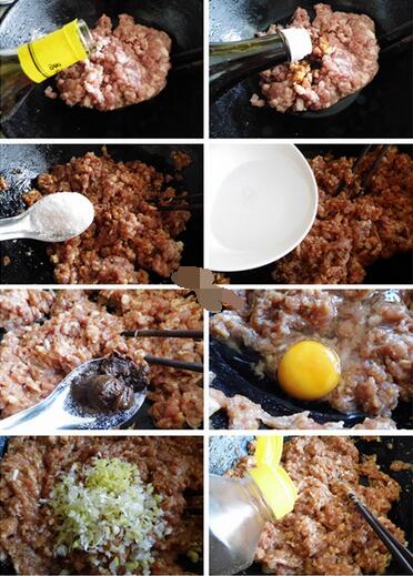 1、肥瘦相間豬肉餡加入料酒,生抽,鹽,一點(diǎn)白水?dāng)嚢?,讓水吃到肉餡中,一勺的黃醬,一個(gè)雞蛋,蔥姜末,攪拌均勻,在肉餡上勁后,最后加入一點(diǎn)香油,備用