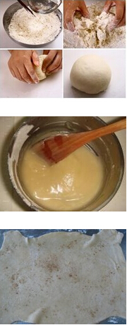 3.取一塊面團(tuán),搟成大皮,抹上餡料中的材料:油,鹽,酥,花椒粉,卷起大餅皮,揪成劑子,把兩端的口收住,卷起,按扁