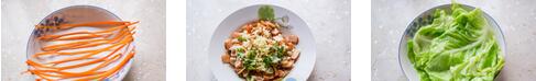 4.取汆燙好的包菜葉,將調(diào)好的肉餡放在葉子一端,像包春卷一樣包起來,用胡蘿卜扎緊,放在盤子里。擺好后,架鍋燒水,鍋上蒸15分鐘即可。