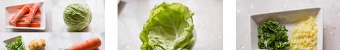 3.汆燙卷心菜:鍋中水燒開,水中加1小勺鹽,將卷心菜放入水中汆燙至軟,然后撈出過涼水。