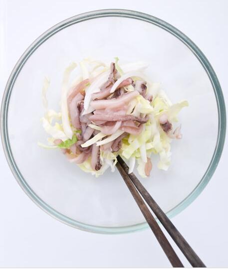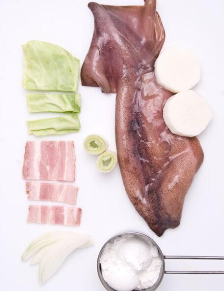 1、洋白菜去梗切絲,培根切絲,洋蔥切絲,大蔥切絲,魷魚去皮切5cm寬的片,