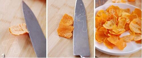 1.橘子剝皮,把外皮朝下,白色一面朝上,用刀慢慢去掉白色部分不要。大約用700g桔子的1/4果皮即可。皮太多了做出的醬就會(huì)過(guò)于苦了