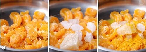 3.果肉放入鍋里,加冰糖,倒入橘皮泥,大火煮開后轉(zhuǎn)小火繼續(xù)煮