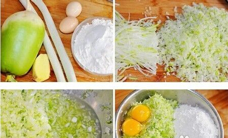 3.姜剁成末,擠過(guò)水分的蘿卜丁、雞蛋、鹽、十三香、面粉一起放入盆里拌勻,蘿卜可以成團(tuán)即可。