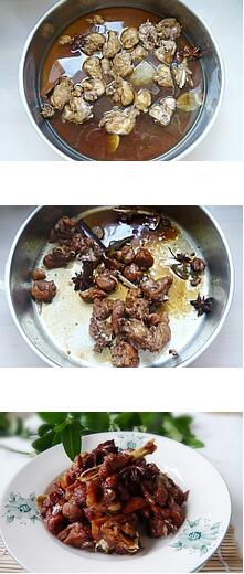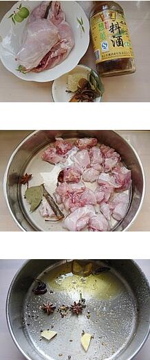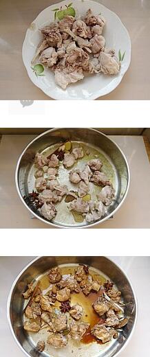 2.坐鍋倒油燒熱煸香剩下的香料,加入焯好水的兔肉到鍋里面一起煸炒,待兔肉表面發(fā)干的時(shí)候加入料酒,醬油,老抽炒勻,再加點(diǎn)水,雞精,冰糖燒開(kāi)改小火燉到肉質(zhì)酥爛加點(diǎn)鹽大火收汁就可以了。