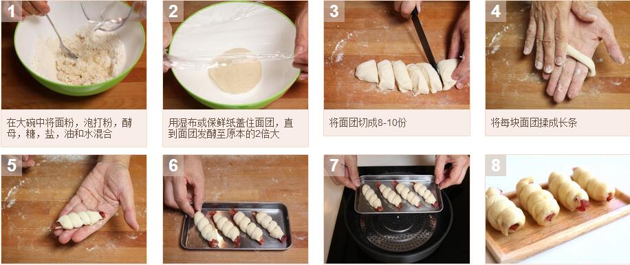 4. 將面團(tuán)切成8-10份,將每塊面團(tuán)揉成長條,繞在臘腸上。然后放在刷上一層油的蒸盤上,隔水高火蒸10分鐘就可以了。