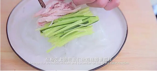 4.將粉皮切小塊放入盤中,再放雞絲,淋入拌勻的調(diào)味料即可