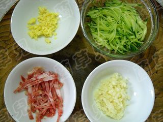 5 姜蒜洗凈切細(xì)粒;黃瓜洗凈切絲;香肚切絲。