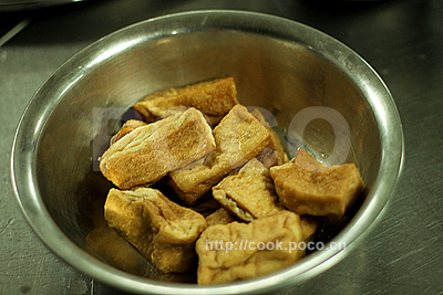2、鍋中下油燒熱,豆腐一片片放入,偶爾搖動炒鍋,約4、5分鐘炸至變金黃色,撈起濾油。(也可直接購買市場的炸豆腐代替,外面金黃,內(nèi)里白嫩)