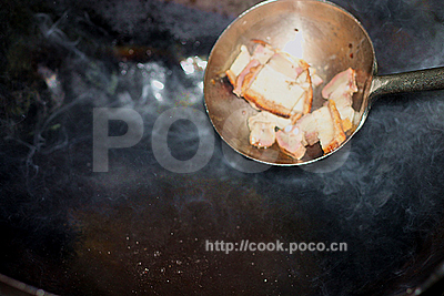 1、豆腐切塊;火腩:粵菜中的一種燒臘制品,是用腌料把豬五花肉腌漬入味,然后燒烤而成。是豬肋骨前后的部份,皮脆、肥廋相間又不太咸,切片待用;彩椒切片;
