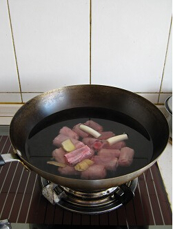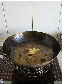 3.放入老抽、香葉、桂皮,炒到上色,然后倒入紅酒沒過牛尾表面,加入白糖、余下的2片姜,用大火將湯汁燒沸,然后加蓋用中小火慢慢燉1小時;