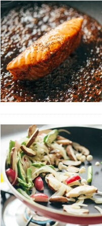 2. 平底鍋加入1/2橄欖油,大火燒旺,放入三文魚。先煎帶皮面,煎約1分鐘。轉(zhuǎn)小火,翻轉(zhuǎn)三文魚,其余每面煎約半分鐘,保持小火,往平底鍋中澆入照燒汁,燒至湯汁粘稠,期間不斷翻轉(zhuǎn)三文魚,收汁后三文魚夾出到盤子中,照燒汁乘出待用。