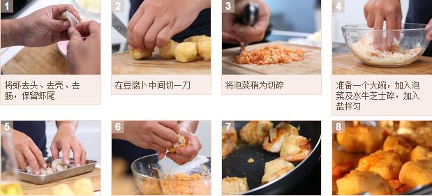 7.將拌好的泡菜芝士餡塞入豆腐卜中,然后在中間放入蝦。