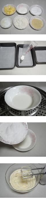 檸檬曲奇的材料:低粉200克,牛奶50克,細(xì)砂糖80克,黃油(室溫軟化)160克,杏仁粉40克,鹽2克,烤盤、油紙適量。裱花袋1個,中號8齒裱花嘴1個 美食網(wǎng)