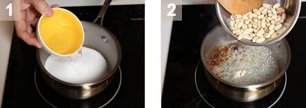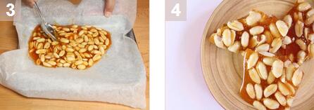 2. 糖會開始融化并慢慢變成焦黃色。當糖開始變色時,加入花生立刻攪勻。