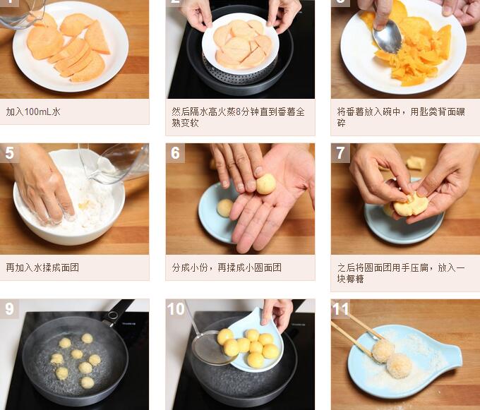 椰香番薯糯米球的材料:番薯250克,米粉170克,薯粉30克,椰糖150克,椰蓉150克,水350mL(150mL用于南瓜,200mL用于做面團(tuán))