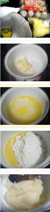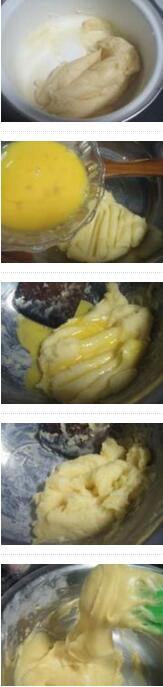 1.黃油軟化與水混合,用小火煮至沸騰,立即離火,然后篩入低粉,用木鏟翻拌至無干粉,再用小火煮至水發(fā),邊攪拌成團(tuán)鍋底有一層薄薄的膜出現(xiàn)就關(guān)火,然后把面團(tuán)倒在另一個碗中