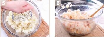 2. 做過到水燒開,放入切塊的薯仔約15分鐘至軟爛,放涼后放到一個大碗,用壓蓉器壓成薯蓉。