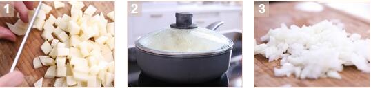 1. 薯仔去皮后切小塊,洋蔥及紅蘿卜切小粒。
