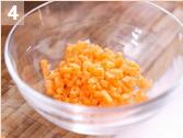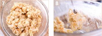 3. 在壓成蓉的薯泥中加入洋蔥、紅蘿卜、免治雞肉拌勻,然后加入孜然粉、辣椒粉、黑胡椒粉及鹽,再加入生粉、雞蛋、麵包糠拌勻。