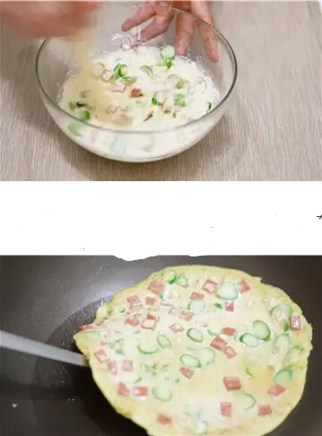 5. 再次熱鍋,轉(zhuǎn)小火,刷上薄薄的一層油,倒入所有食材,攤開(kāi)成圓餅。待蛋液表面半凝固時(shí)翻面,繼續(xù)煎約1分鐘后,翻面出鍋