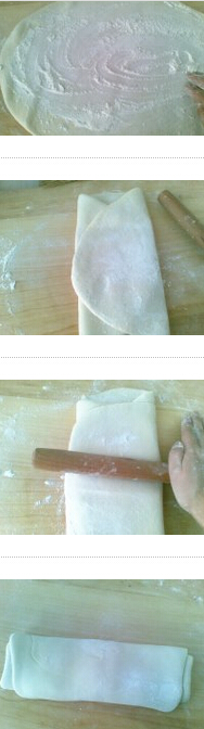 7.用搟面杖壓平,再搟成片,繼續(xù)抹面粉,疊起來,壓平,如此反復(fù)7,8次