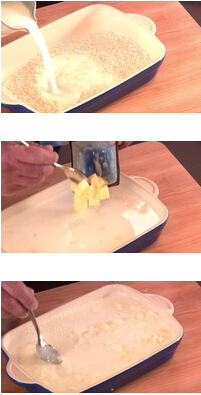 1.將大米洗凈瀝干后放入派盤中,倒入牛奶,加入切成小丁的黃油