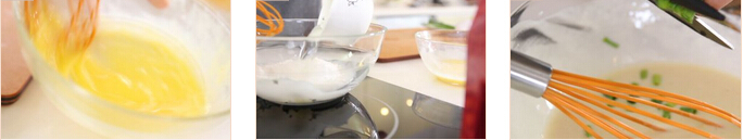 1. 將一只雞蛋打入碗內(nèi)。用另一只攪拌碗混和面粉、粟粉及水,打發(fā)均勻,將蛋液倒入面糊拌勻,加鹽調(diào)味,再加入蔥花混和 學做菜