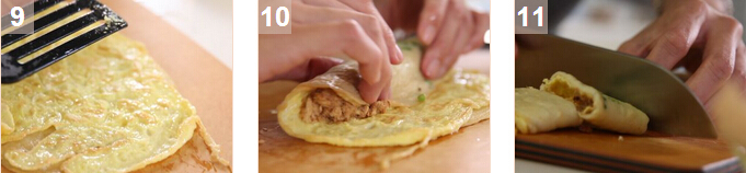 5. 當?shù)凹迨?,把蛋餅放上蛋面,在中間鋪上肉松,然后卷起蛋餅,最后,將蛋餅卷切小段就可以吃了