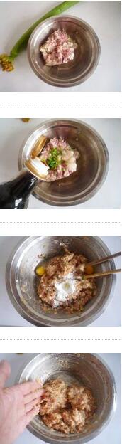 1. 豬肉餡放到碗中加入蔥姜末、食鹽、味精、胡椒粉、生抽、料酒香油拌勻,然后再加入半個蛋清和一勺生粉拌勻順一個方向攪打上勁,并用手摔打肉餡幾分鐘,讓肉餡更更有黏性。
