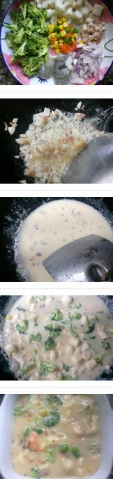 2.黃油放到鍋中加熱至完全溶化后,放入洋蔥丁炒香后放入培根一起煎炒,加入面粉拌成糊狀,加入三花淡奶,注入適量的水,水開后,放入鮮蝦、西蘭花、蘑菇、雜蔬煮開鍋后放入鹽,黑胡椒粉