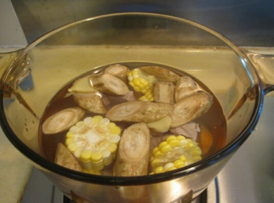 豬骨牛蒡湯的材料:牛蒡100克,玉米150克,紅蘿卜100克,豬骨頭250克,食鹽