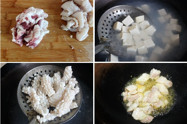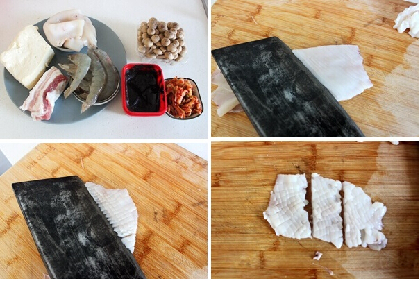 泡菜海鮮豆腐湯的材料:豆腐200g、五花肉100g、蝦8個(gè)、魷魚(yú)2條、辣白菜一小碗、韓式辣椒醬1大勺、蘑菇100g、料酒1小勺、大蔥1段、料酒少許
