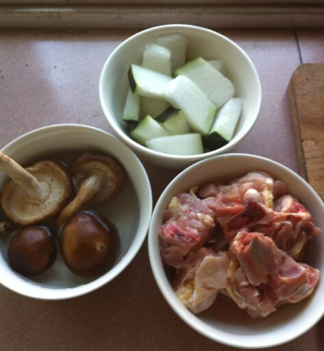 冬瓜雞肉的材料:雞肉250克,冬瓜200克,蔥1根,香菇,白胡椒粉,料酒,
