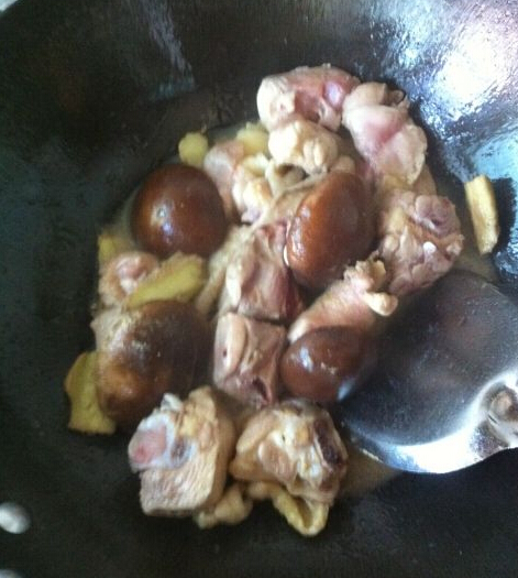 3.熱鍋,下雞塊煎(不用放油),煎的過程中放入姜片,香菇,煎到兩面都發(fā)黃的時(shí)候倒入料酒,灑一點(diǎn)白胡椒粉 怎么做好吃
