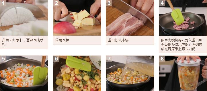1.洋蔥、紅蘿卜、西芹、蘋果洗凈切成小粒,煙肉切成小塊。