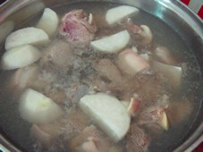 1 冷水放羊肉蘿卜,一起燒開(kāi)煮一會(huì),到很多臟末出來(lái),撈出羊肉洗凈,蘿卜丟掉。