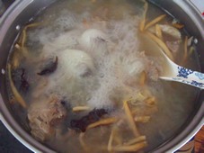 3 放入黃花菜和木耳煮一會(huì),調(diào)味,鹽,胡椒粉。
