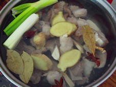 2 羊肉和香料一起燉到湯汁發(fā)白,我燉了五個(gè)小時(shí),冷卻,撈出的羊油,用來(lái)燙辣椒油,可真棒。