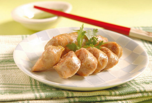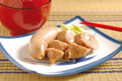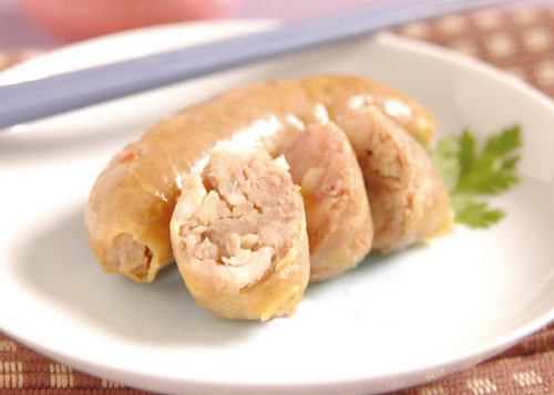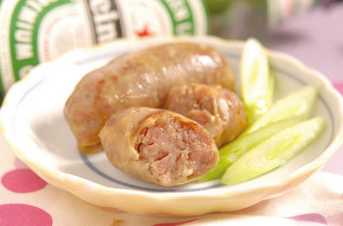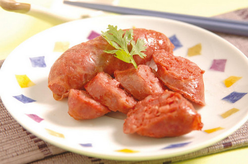 攪拌后的肉餡可先甩一甩,以增加彈性和黏性,灌香腸時千萬不要因為貪心而將材料塞太滿,以免一放入油鍋油炸就會露餡了!放入油炸時可在冷油就將香腸先行放入,如此一來可以避免香腸外表燒焦、里面不熟的失敗,且油炸時要開小火慢慢炸到表面逐漸呈金黃色就可以上桌,不過現(xiàn)代人講求健康料理法,因此我們也可以用家里烤箱160℃先預熱3分鐘,再將香腸放入烤10分鐘即可,或直接用電鍋蒸熟,也不失為一好料理方法喔!自己作出來的香腸色澤并不像市面販賣的香腸紅潤,那是因為強調不添加亞硝酸鹽,但是100%健康安心的保證喔!