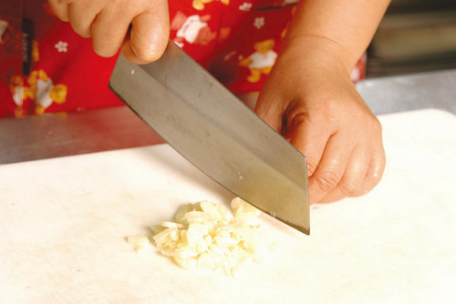 2、把紅蔥切成碎末;蒜頭拍打并切成蒜末備用。